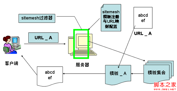 通過Sitemesh的注冊機制,告訴Sitemesh,當訪問該路徑時使用XXX模板(假定使用前面那個模板)來修飾被訪問頁面。