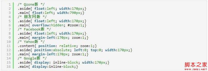 Qzone、朋友網、Facebook都給左欄浮動,唯一不同的是右欄的寫法,Qzone給右欄定寬並且浮動,而朋友網和Facebook則並沒有給右欄定寬也未浮動,而是利用了創建BFC並且為低版本IE觸發hasLayout的原理讓右欄自適應寬度。