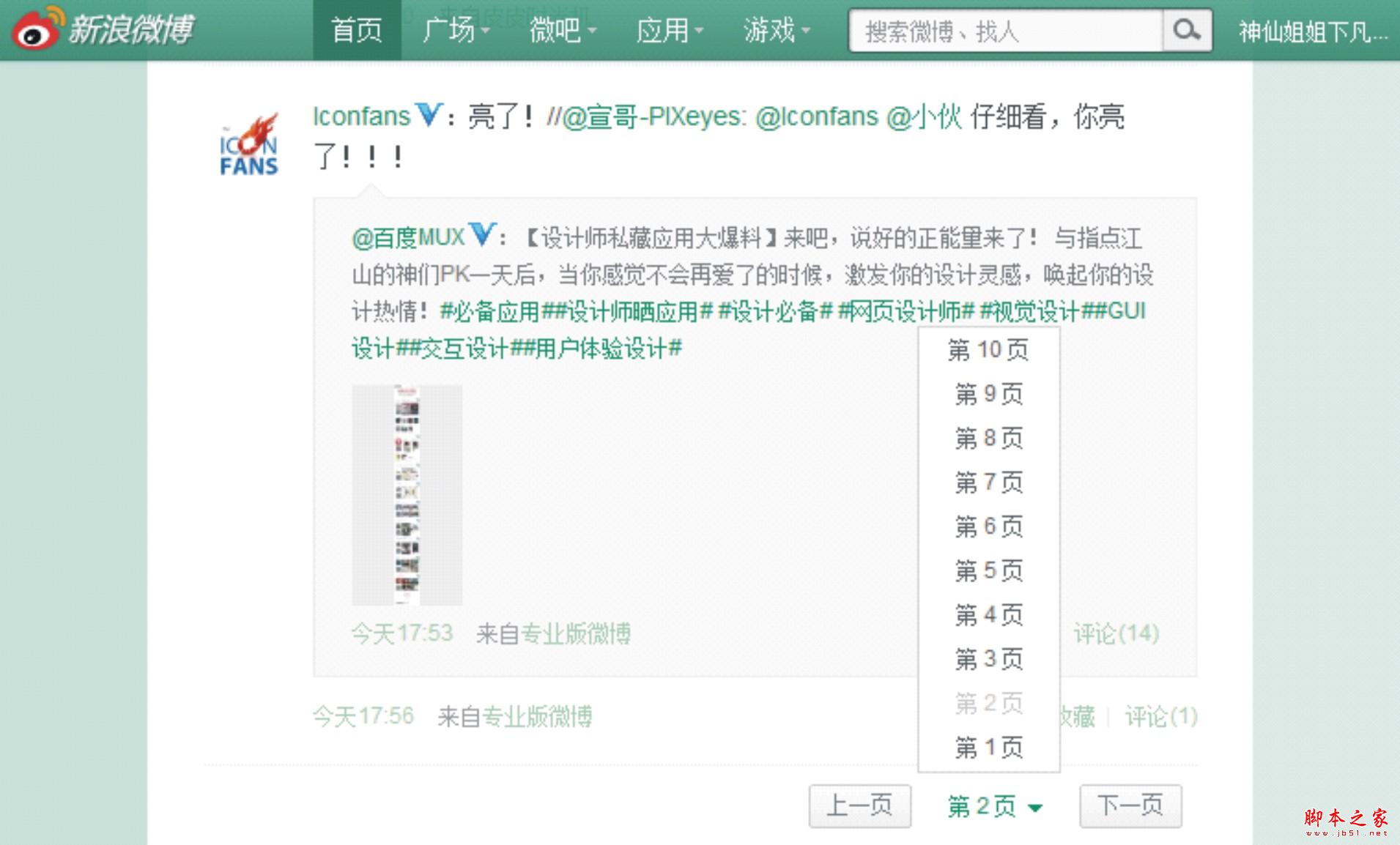 用戶浏覽的信息是關注的信息,會像讀報紙一樣逐頁的浏覽下去,因此"上一頁""下一頁"用的次數最多;其次是跳轉翻頁,為體現輕量微博的概念,將傳統翻頁的中間頁碼部分簡化成下拉菜單,既能標識當前頁位置又能翻頁切換跳轉;