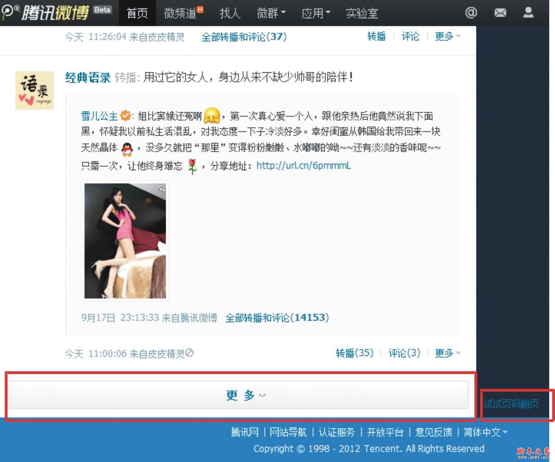 1.騰訊weibo:一頁45條微薄,更多默認顯示更多按鈕,點擊後下面又多顯示45條,以此類推;同時騰訊還推出頁碼翻頁模式供用戶選擇