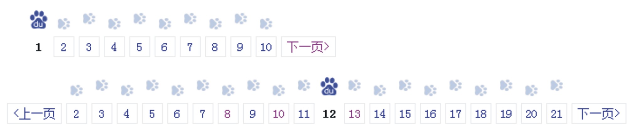 1.搜索結果首次只提供10個頁碼;一般用戶在這10頁內還沒找到想要的內容應該會更換搜索內容。腳印圖形和下面頁碼對應都可點擊翻頁,增加了頁面趣味性