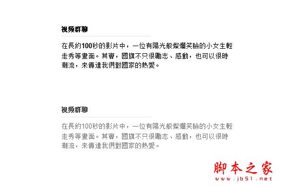 在大量文字編排時,運用文字顏色的面積也時我們要考慮的方面,通常,為了保持脈絡清晰,我們會賦予標題或重要文字等小面積、關鍵性內容以深、鮮的顏色,而大面積的一般性文字則用深灰#333,或#666等灰度顏色。#333因為含有少量白色的成分,因此它在白色底上不會很對比強烈,同時由於它是絕大部分仍是黑色組成,因此,又能保證辨認清晰。此 類的顏色其實很多,在運用時加以合理分配,會使整個網頁看起來清晰而用舒適。