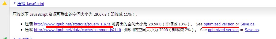 比如jquery.form.js,最小化後減少11.9kb,減少54.8%的空間。點擊minified version,在新窗口中可以看到Page Speed為你優化好的版本,直接更新到服務器就可以了。