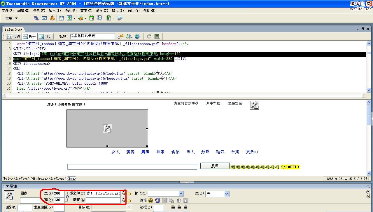此時你可以通過修改代碼來修改圖片的地址,也可以通過修改上圖中紅框內的內容來修改圖片的地址。其中“源文件”就是圖片的地址,因為我的圖片是保存在css文件夾的,所以我將其修改成“css/logo.gif”;下面的“鏈接”就是這張圖片所要鏈向的地址,我這裡不想給這張圖片加鏈接,所以留空,你可以加上鏈接,如果是鏈向網絡的絕對地址記得要使用帶http://的完整地址。修改好後點擊“文件”》“保存”,這樣就將修改好的保存起來了,用浏覽器打開這個網頁文件就可以浏覽到修改後的樣式和內容。