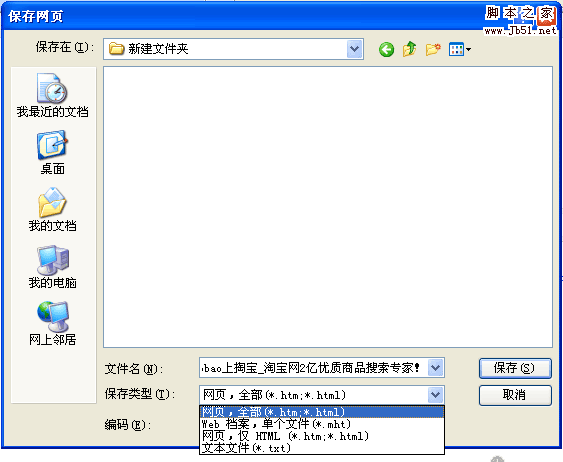 然後在彈出來的對話框中選擇你要保存到的文件夾,同時在保存類型上選擇“網頁,全部(*htm,*html)”,然後點“保存”。這樣就可以將這個網頁上的所有內容都保存到我們自己的電腦上了,包括圖片和一些JS文件等。如下圖所示: