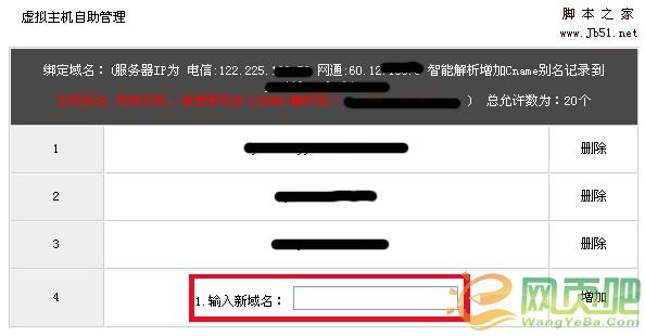 因為我之前綁定了三個域名,所以這裡可以看到我已經綁定了三個;在“輸入新域名”的框框裡輸入你需要使用的域名,因為我之前用www.6read.com解析到了這個空間上,所以這裡我應該填入“www.6read.com ”。然後點擊後面的“添加”。