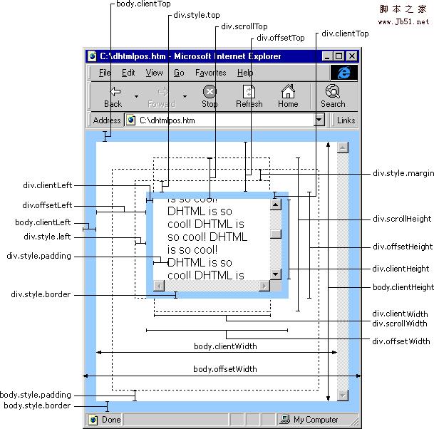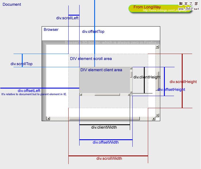 注釋2:第二幅圖主要是針對網頁中一個div的各個屬性值所做的說明。“DIV element client area”是這個div元素的可見區域,“scroll area”是這個div內容原始尺寸,但是由於div的css所設置的高度寬度容不下它的內容,所以出現滾動條。