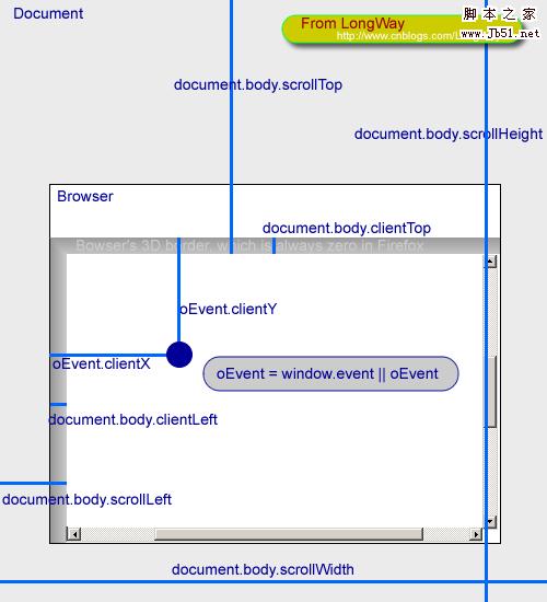 注釋1:上圖整個大背景是這個網頁的全部尺寸,中間的小框才是浏覽器中的可見尺寸。這幅圖就是針對為文檔(document)的各個height、width、top、left所做的說明。