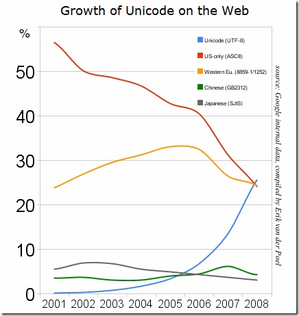 由此圖可以看出,2001-2008年期間,GB2312編碼的使用情況雖然幅度不大,但還是在穩定上升的;藍色的線表示出用UTF-8的網站越來越多了。