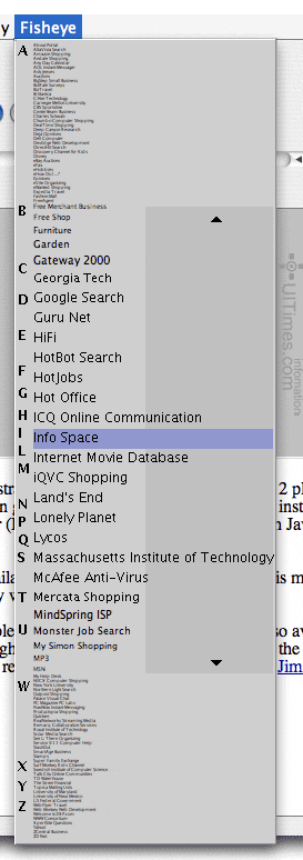 滾動條的拖動,或者翻動書頁,都會讓你浪費較多時間。Fisheye menus是HCIL(人機交互實驗室,UMIACS的下屬實驗室之一)的研究成果之一,為了浏覽者更加方便快捷地使用內容較多的菜單提出的一種解決方案。但一定程度上可以作為詞典類導航設計的借鑒。下圖為他們的魚眼菜單:
