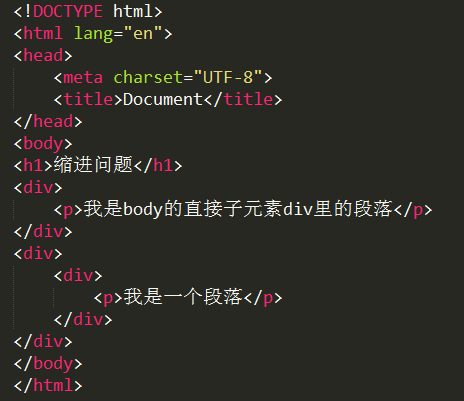 (1).每一個塊級元素都另起一行,每一行都是用tab縮進對齊。注意:html、 head、 body 以及body下的第1級標簽(即直接子元素)不縮進,其他的都正常縮進。如下圖所示:
