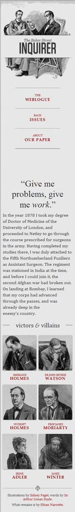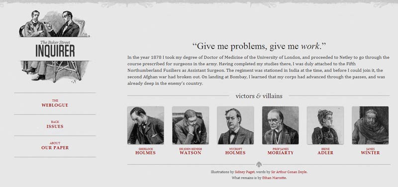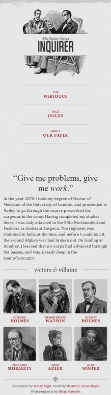 他制作了一個范例,裡面是《福爾摩斯歷險記》六個主人公的頭像。如果屏幕寬度大於1300像素,則6張圖片並排在一行。