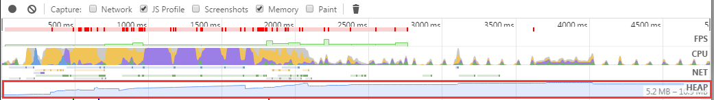 當打開memory時,會在NET下面產生一個HEAP展示圖,該圖展示了js堆內存的使用情況,如圖