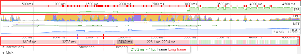 頁面活動時的FPS變化信息,通常設備的屏幕的刷新頻率是60FPS,超過的話,則有可能產生卡頓現象,可參考這篇介紹 (需FQ)