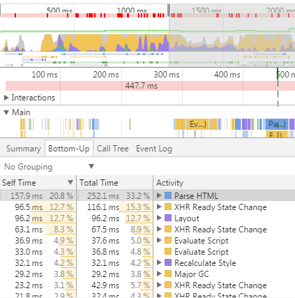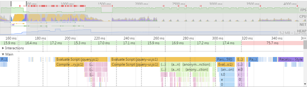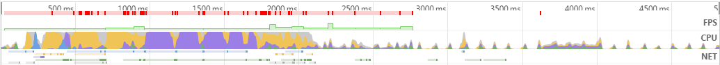 記錄浏覽器內核的運行情況,以曲線區域圖的形式展示。黃色的表示對js的操作所占內存(js代碼評估及函數調用),藍色表示對html操作所占的內存(主要是html編譯),紫色表示對css操作所占的內存(css樣式計算等),灰色表示其他操作所占的內存