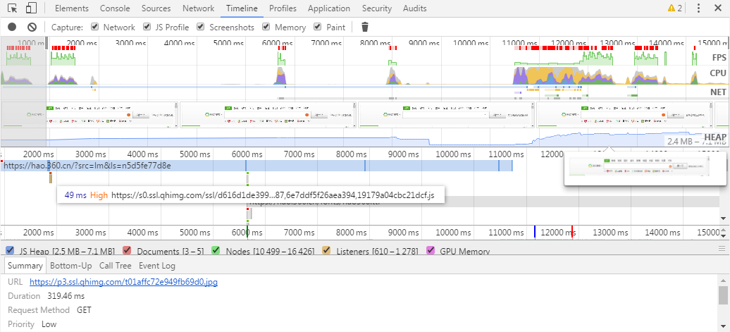 最新版本的chrome在js profile選擇框前面加了個network選擇框,當選擇network時,會將此處作為network信息面板,可通過鼠標懸浮network面板上的條狀來查看沒個資源的請求情況