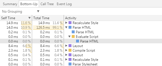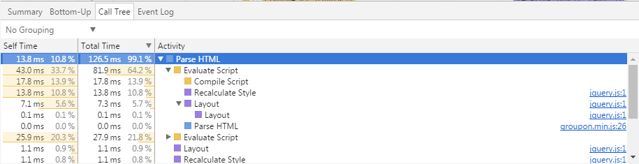 可以看出耗時最長的是html編譯及其所花費的時間,其次是一個XHR請求...在這個面板的左上角還有分組篩選,將列表數據分別以activity、category、domain、subdomain、url歸類到一起。