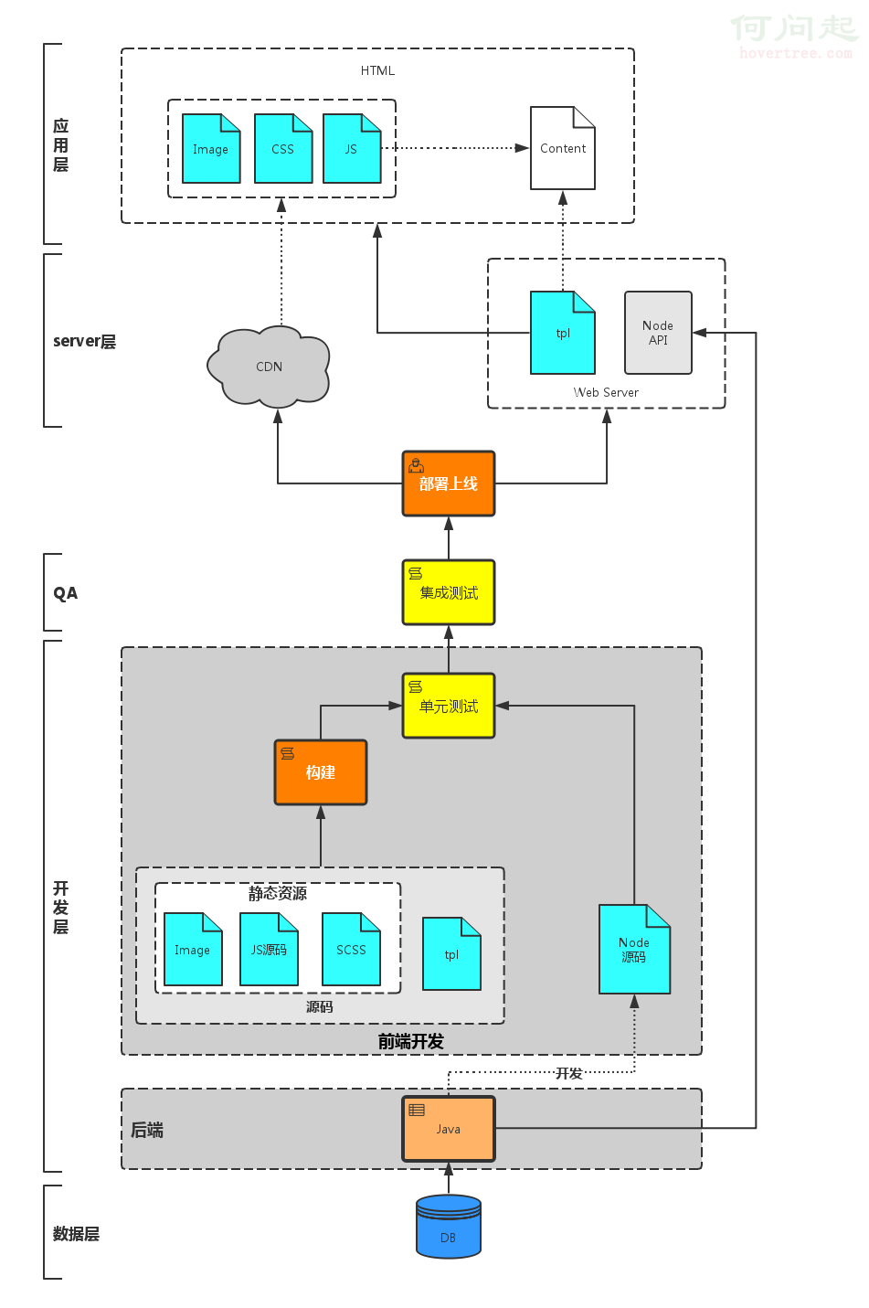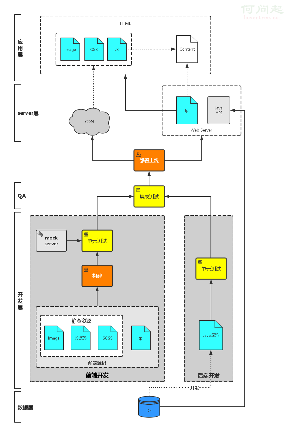 上圖是一個比較成熟的前後端協作體系。當然,目前由於Node.js的流行開始普及大前端的概念,稍後會講述。