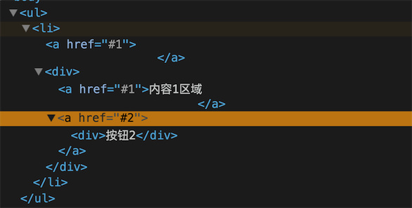 很多時候我們會有下面的場景,如下圖中所顯示的那樣。點擊1區域(從圖上看1區域包含2區域)和2區域跳轉不同的鏈接。
