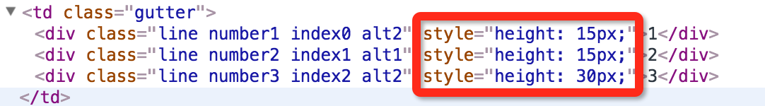 使用開發者工具查看SyntaxHighlighter所渲染的元素可以看到,每個行號和每行代碼都是一個div,而由於是行號和代碼是分別放在兩個td中進行的高度計算,導致了在其中一部分出現高度變化時,兩部分的高度不同。