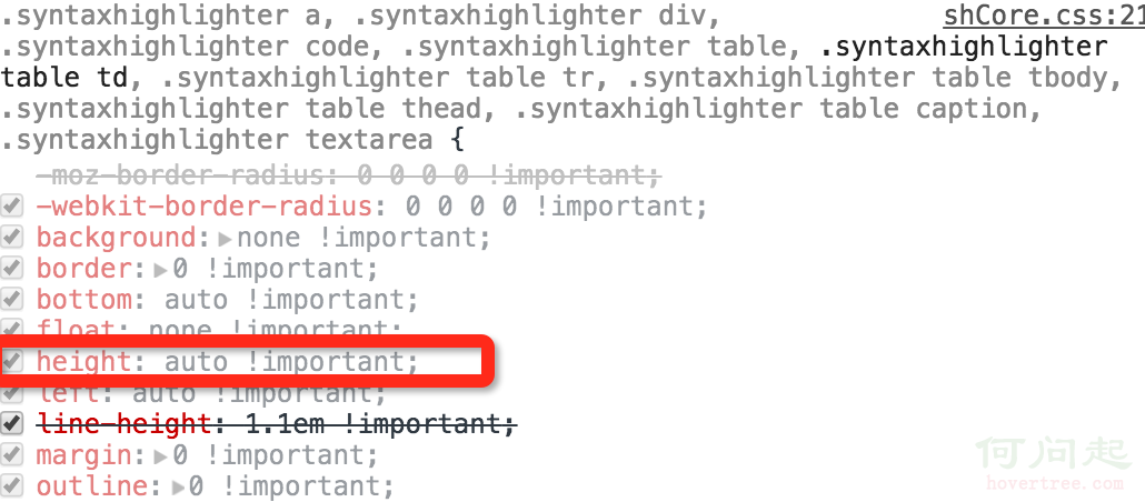 查看style渲染過程,可以看到,高度是被SyntaxHighlighter默認css中通過important覆蓋了