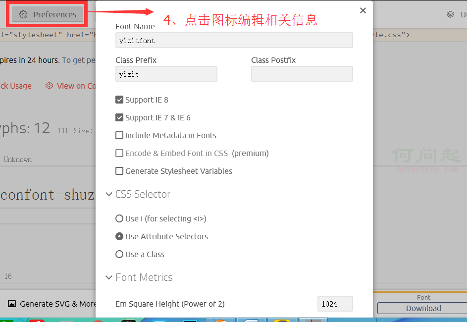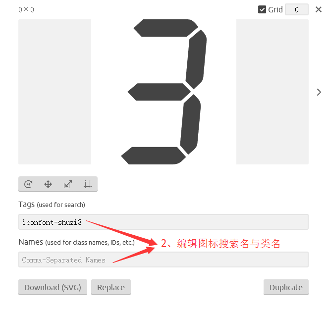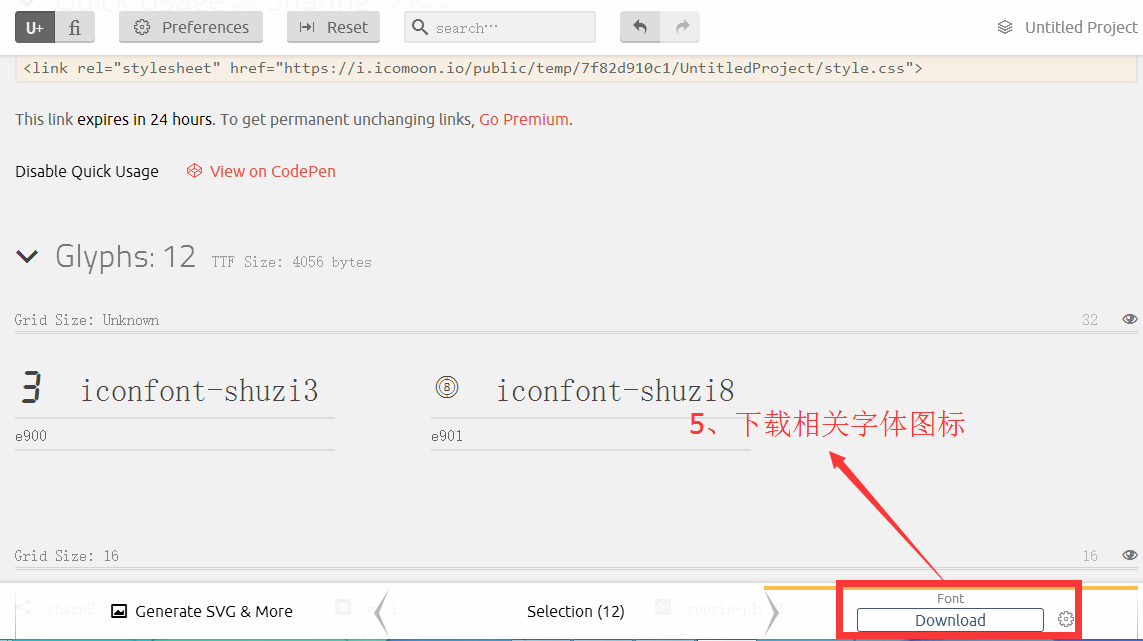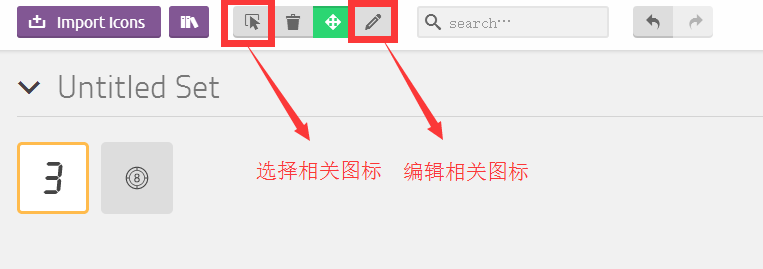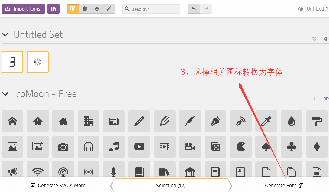將相關圖標導入IcoMoon(https://icomoon.io/app/#/select),並對每個圖標進行命名編號,最後對整個圖標字體進行命名且導出字體及相關文件