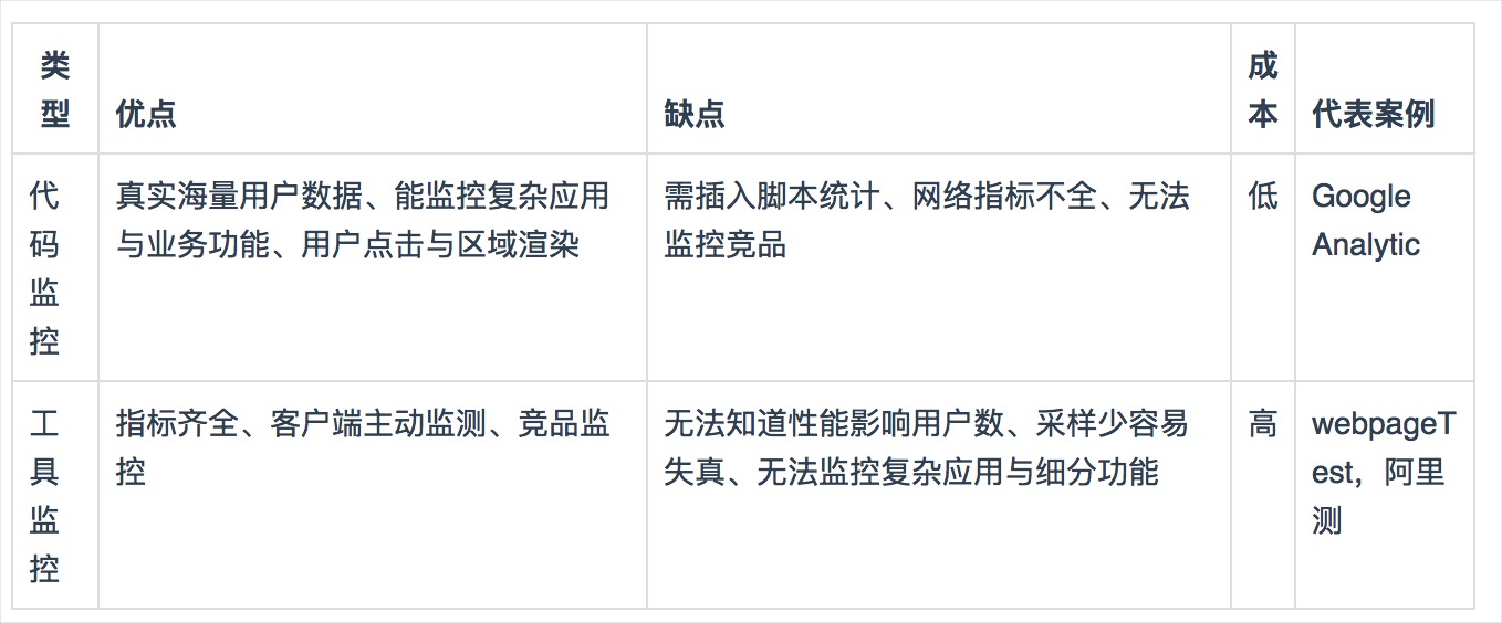 目前前端性能監控系統大致為分兩類:以GA為代表的代碼監控和以webpagetest為代表的工具監控。