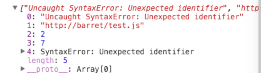這樣的話,異域的test.js文件中發生異常時便可以被當前域的onerror監聽捕獲到詳細的異常信息。
