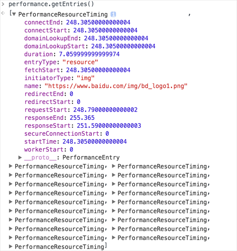 可以看到performance.getEntries返回一個數組,數組的每個元素代表對應的靜態資源的信息,比如上圖展示的第一個元素對應的資源類型initiatorType是圖片img,請求花費的時間就是duration的值。