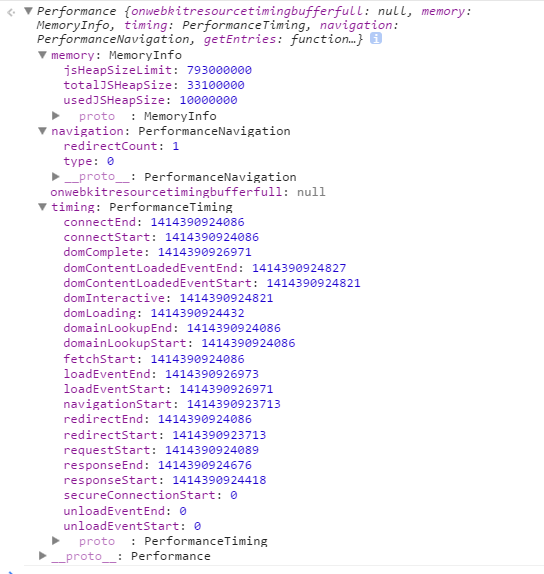 redirectCount:重定向的數量(只讀),但是這個接口有同源策略限制,即僅能檢測同源的重定向;最重要的是timing字段的統計數據,它包含了網絡、解析等一系列的時間數據。