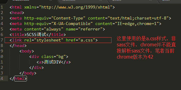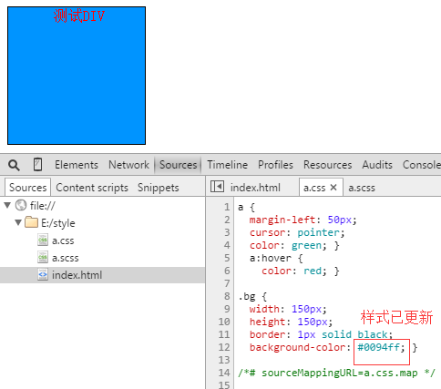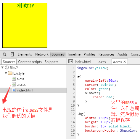 第三步:在chrome浏覽器中打開這個html頁面,細心的可以發現,chrome浏覽器中加載出來的a.scss文件,這個文件就是本次調試的關鍵
