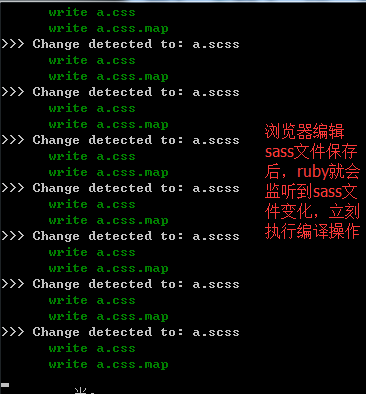 第五步:鼠標右鍵保存,ruby就會開始編譯,看圖如下:(切記scss文件中千萬別出現中文,中文會導致ruby執行編譯報錯),