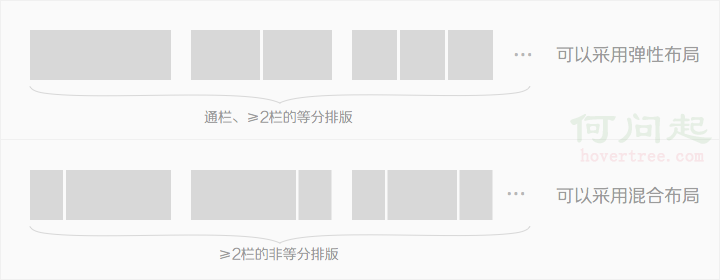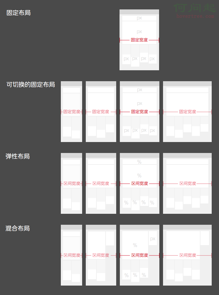 采用何種方式實現布局設計,也有不同的方式,這裡基於頁面的實現單位而言,分為四種類型:固定布局、可切換的固定布局、彈性布局、混合布局。