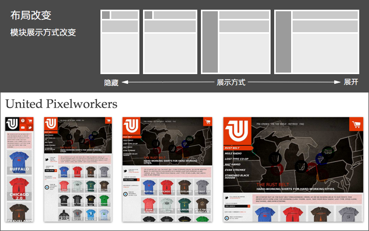 很多時候,單一方式的布局響應無法滿足理想效果,需要結合多種組合方式,但原則上盡可能時保持簡單輕巧,而且同一斷點內(發生布局改變的臨界點稱之為斷點)保持統一邏輯。否則頁面實現得太過復雜,也會影響整體體驗和頁面性能。