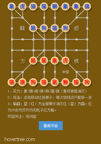 3、輸贏:藍(紅)方全部棋子消滅紅(藍)方贏。紅方20步內雙方均無吃子紅方輸。
