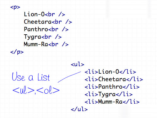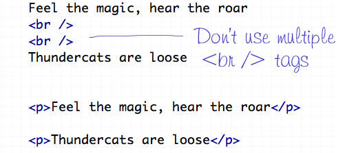 <br />換行標記只應該用於插入是在第一個文本流換行符敲到一個新行一個特別字了。它不應該被用來制造元素之間的差距,而是分裂成不同的段落,或調整的幅度CSS樣式的文本。