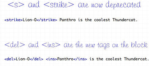 在昔日,<S>和<strike>允許用來定義網站文字。不過,現在他們被定義為不推薦使用的標簽,當他們任然可以有效果.現在用新的標記集- <del>和<ins>。來替換<s><strike>