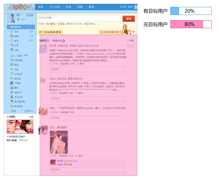 對SNS類網站來說,用戶大多數時間是在“隨便看看大家都在干什麼”,當然也有時,用戶來到首頁進行發表日志,上傳照片等目標明確的操作。