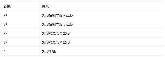 •context.arcTo(x1,y1,x2,y2,r); 在畫布上創建介於兩個切線之間的弧/曲線。接收的參數含義: