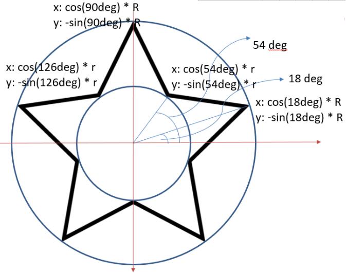 通過對五角星分析,我們可以確定各個頂點坐標的規律,這裡需要注意的一點是:在canvas中,Y軸的方向是向下的。