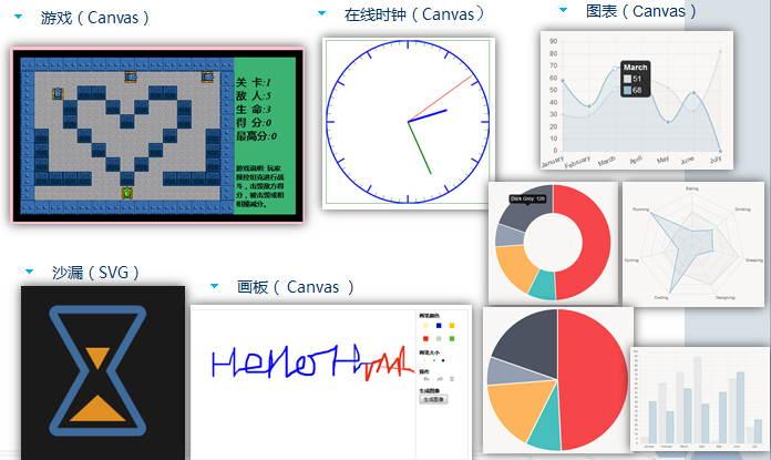 •視頻/音頻 、畫布 & SVG 、可編輯內容 & 拖放、Web存儲、Web Worker 、服務器發送事件、表單增強功能、語義化標記、更多HTML5標准
