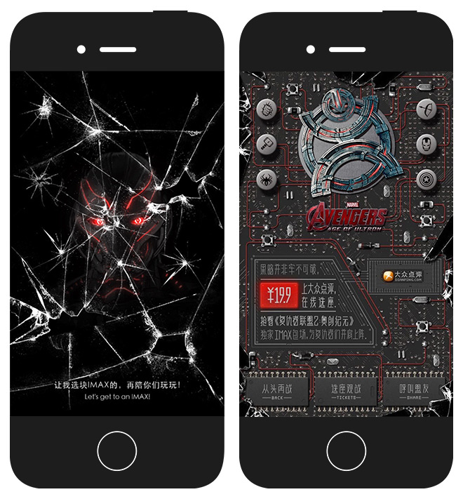 如果沒記錯這是第一個電話場景模擬作品,故事講述的你收到了一個未知來電,接聽後屏幕似乎問到了殺氣;緊接著被婦聯的人物武器不斷破擊手機屏幕,“碎屏”的創意表現手法與《復仇者聯盟2》的電影調性完美結合;再通過專業的配音和場景音效來襯托出大片既視感,巧妙的把用戶吸引到19.9元購影票的營銷點上。
