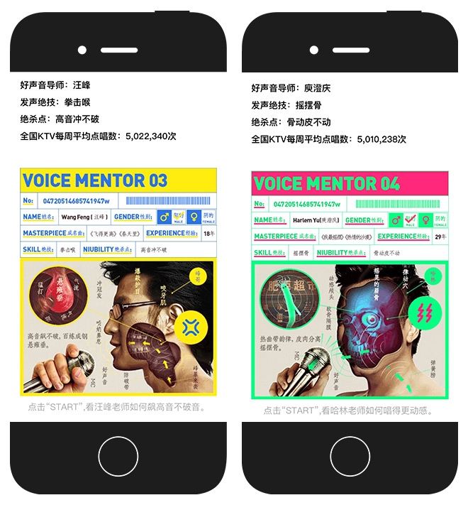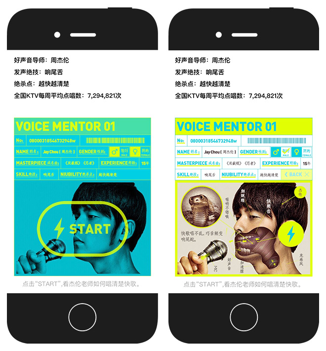 視覺一看就是W的作風,W一直給我們帶來生動有趣的畫面。而這一次是偽裝成微信文章頁面,據說當時很多小編看了這個文章後以為微信又要出新花樣了,可以文章植入H5,而實際上這是使用H5技術偽裝成微信文章(如何識別是否偽裝?點文章底部舉報就知道了)。在營銷策略上利用當時很火爆的選秀節目中國好聲音,結合四大導師來推廣大眾點評的KTV資源。