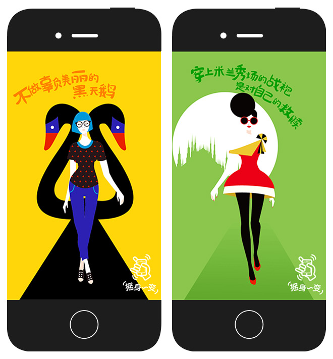 來自背景LXU團隊的H5作品,利用了重力原理通過搖一搖換裝,就在一秒之間讓畫面內的女孩瞬間變換出不同地域風格的著裝。畫面感非常鮮艷時尚;裡面有一句話