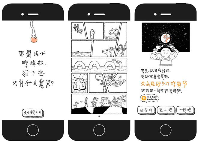 這個創意點從我們能夠想象到的吃的源頭做推敲,利用漫畫的表現方式來肆無忌憚的強調吃這個事兒...好吧,我詞窮了... 不瞎扯,看作品把~