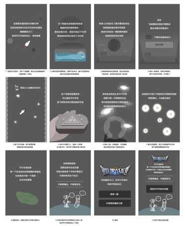 我們不希望用純文字去解釋這些學術觀點會顯得枯燥乏味且未必能精准傳達,最終我們決定將HTML5 頁面做成一個有故事背景貫穿的輕游戲的方式,在過程中設計了幾個互動點讓用戶能潛移默化從中感受到我們所傳達的“平行宇宙”的概念,其中講幾個關鍵節點設計了互動設計,幾個圖像。