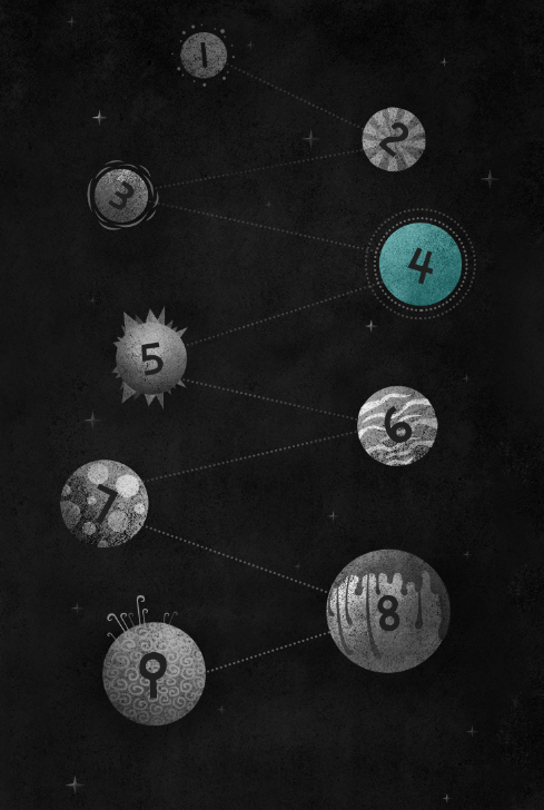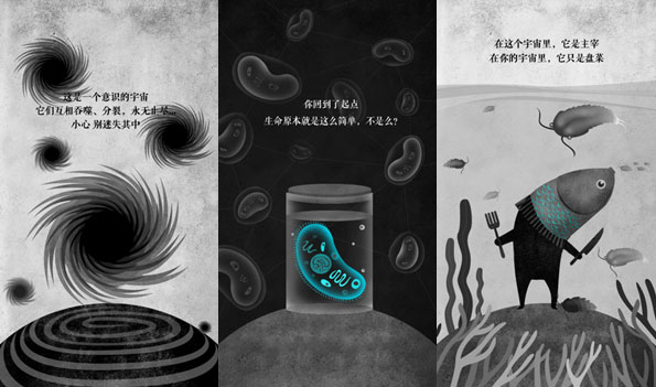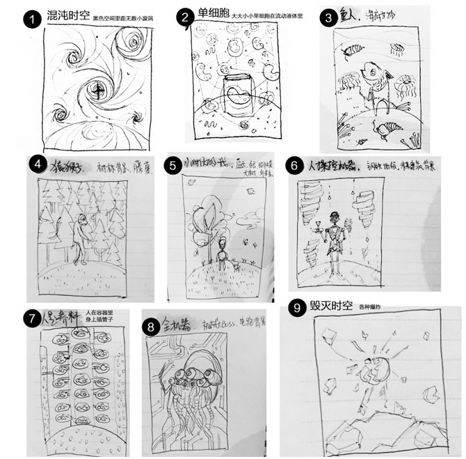 貼合劉慈欣的世界觀裡指出的觀點,將平行宇宙設計成了9個宇宙,因為它具有一定的科學性質,所以把整個生物進化論與9個宇宙結合,為了表達出其觀點“數字越小,離本宇宙差異越大”,所以進行了差異化順序排列,讓用戶能在體驗中通過圖像來理解其奧義。