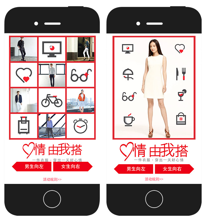 真正能和讓用戶更好的理解品牌是讓用戶在參與進來深入感知,雖說小米的參與感已被說爛,但不得不承認擁有能讓用戶參與體驗的H5會更加有趣和讓用戶喜愛。你可以結合產品本身的特性以及用戶的喜好進行參與機制的設置。優衣庫為推廣春季新裝,推出自主拼裝H5游戲,就能讓用戶過一把購買前為自己裝扮的體驗,同時滿足用戶的創造表現需求。