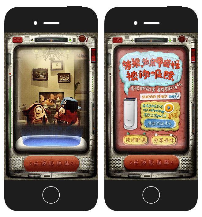 場景化與故事化,在某個角度上已經確定用戶能快速接受H5承載的品牌信息。但要加深他們對品牌的印象,那麼H5設置上讓這些場景能生動起來,最好能還原現實場景,比如現在流行的AR、VR就是在行駛這樣的功能。場景現實化、加入互動機制,能讓用戶進一步感知體驗H5宣傳的品牌產品,提高對產品的購買欲望。蘇泊爾“誰先住進你新房”在設置中將空氣淨化器吸怪味的產品功能,很好融入到互動機制中,用戶點擊長按吸怪味,整個頁面就像淨化器在工作,配合場景設計,讓用戶有種身臨其境的感覺。