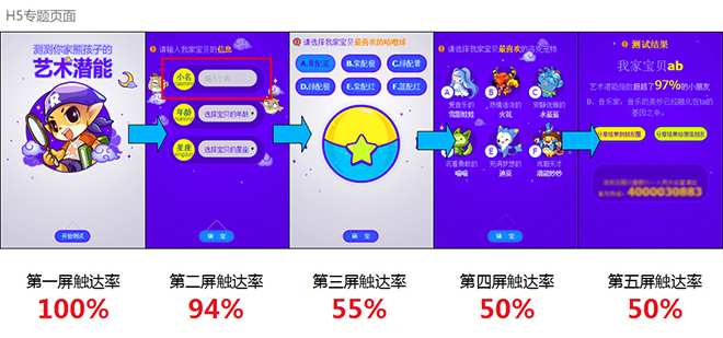 跟PC情況相似,用戶觸達率隨著頁面層級加深而減小。下例的H5小游戲裡,用戶先進入一個地圖首頁,點擊“開始游戲”會跳轉到游戲頁面,再進行性別選擇和操作提示,最後才到達游戲。每一步的操作都有部分用戶流失。